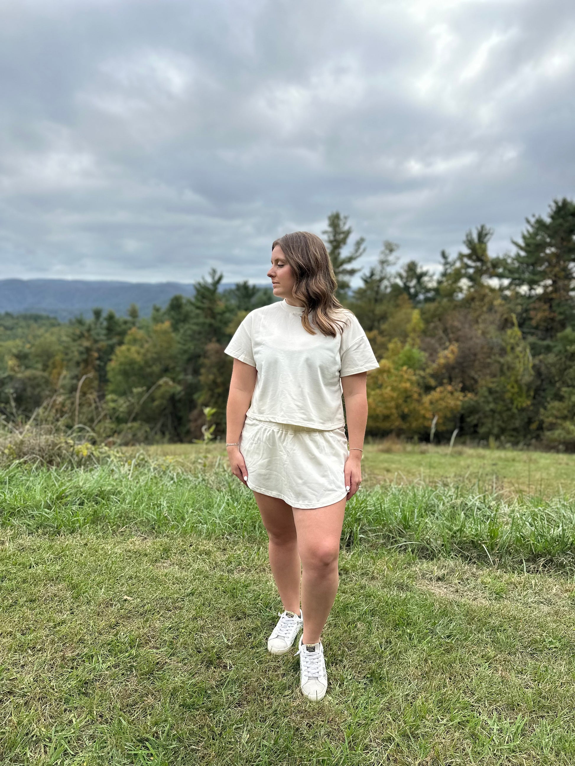 Cropped Tee and Ruffle High Waist Skort Set - Cream color